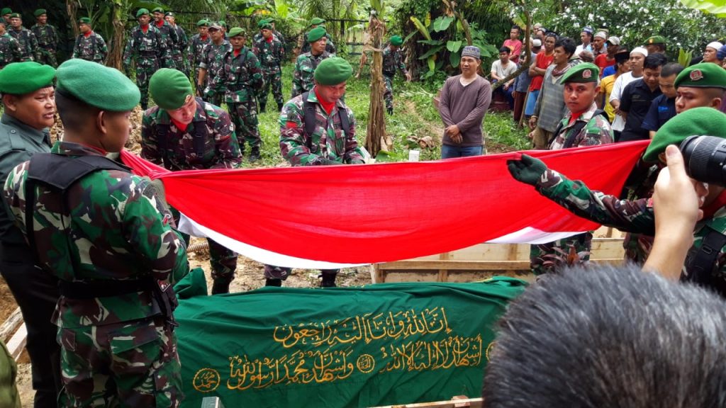 PALEMBANG, SONORA – Suasana haru iringi prosesi pemakaman Serka Anumerta Iskandar Zulkarnain, anggota TNI dari Kodim 0402 / Ogan Komering Ilir (OKI), Sumatera Selatan, yang gugur dalam tugas membantu masyarakat menghalau gajah liar hari ini Kamis ( 5/3/2020) . Serka Anumerta Iskandar Zulkarnain dimakamkan dengan prosesi militer di TPU Bawa Kabung Desa Sungai Kedukan Banyuasin . Almarhum meninggalkan seorang istri dan 2 orang anak.