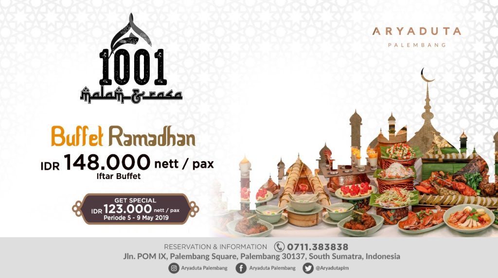 1001 Malam& Rasa adalah tema yang diusung Aryaduta Palembang dalam bulan suci ramadhan tahun ini, dengan IDR 148.000 nett/orang,pengunjung dapat menikmati all you can eat iftar buffet di The Kitchen Restaurant setiap harinya dari pukul 17:30 – 21:00 yang menyediakan berbagai menu istimewa khas Indonesia danTimur Tengah. Musik akustik dan gambus akan meriahkan Iftar Buffet kali ini. Aryaduta Palembang juga memberikan harga khusus bagi pengunjung yang akan berbuka puasa pada tanggal 5-9 Mei 2019, yaitu hanya IDR 123.000 nett/orang saja. Pembayaran menggunakan OVO juga bisa mendapatkan keuntungan cash back sebesar 10% dan bagi nasabah Bank Mandiri, dapat mendapatkan potongan sebesar 50% dengan mengunakan Mandiri fiesta poin.