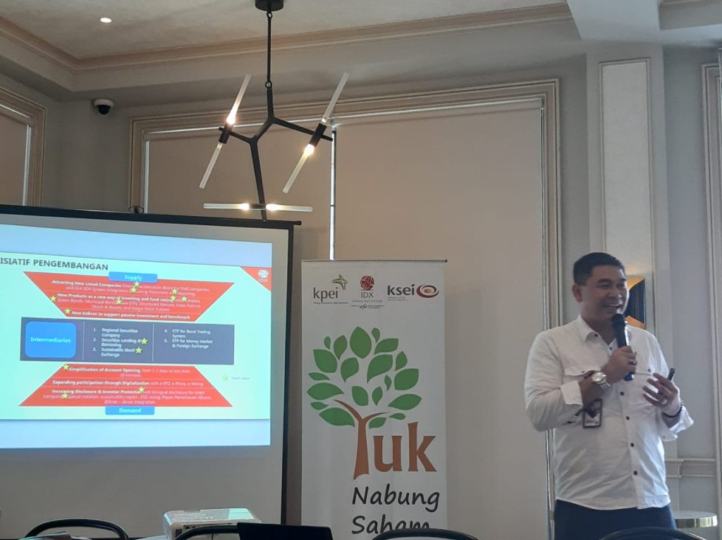 PALEMBANG,SONORA – PT Bursa Efek Indonesia (BEI) Kantor Perwakilan Sumatera Selatan , menggelar Workshop Pasar Modal, untuk kalangan wartawan Sumatera Selatan di Lynn Café dan Resto Jalan Kironggo Wirosentiko Palembang hari ini, Jumat ( 14/02/2020 ) . Kegiatan yang bertajuk “Pasar Modal sebagai Sumber Pembiayaan dan Media Investasi , diikuti oleh wartawan di Provinsi Sumatera Selatan. Kegiatan ini menghadirkan pembicara Kepala Perwakilan Bursa Efek Indonesia Sumatera Selatan Hari Mulyono.