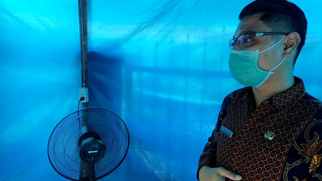 “Dinding dengan menggunakan plastik, atap kita menggunakan seng, dan juga untuk penyemprotannya kita gunakan kipas angin blower,” ujarnya.