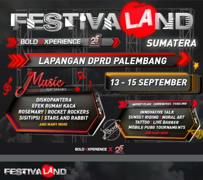 di Palembang. Rangkaian roadshow FESTIVALAND ini diselenggarakan oleh LAzone.id & Bold Xperience, berkolaborasi dengan Dyandra Promosindo. Selain Palembang, Festivaland jugadiadakan di Manado, Banjarbaru, Makassar, Pontianak, Samarinda, Pekanbaru, Jember, Purwokerto dan Semarang.