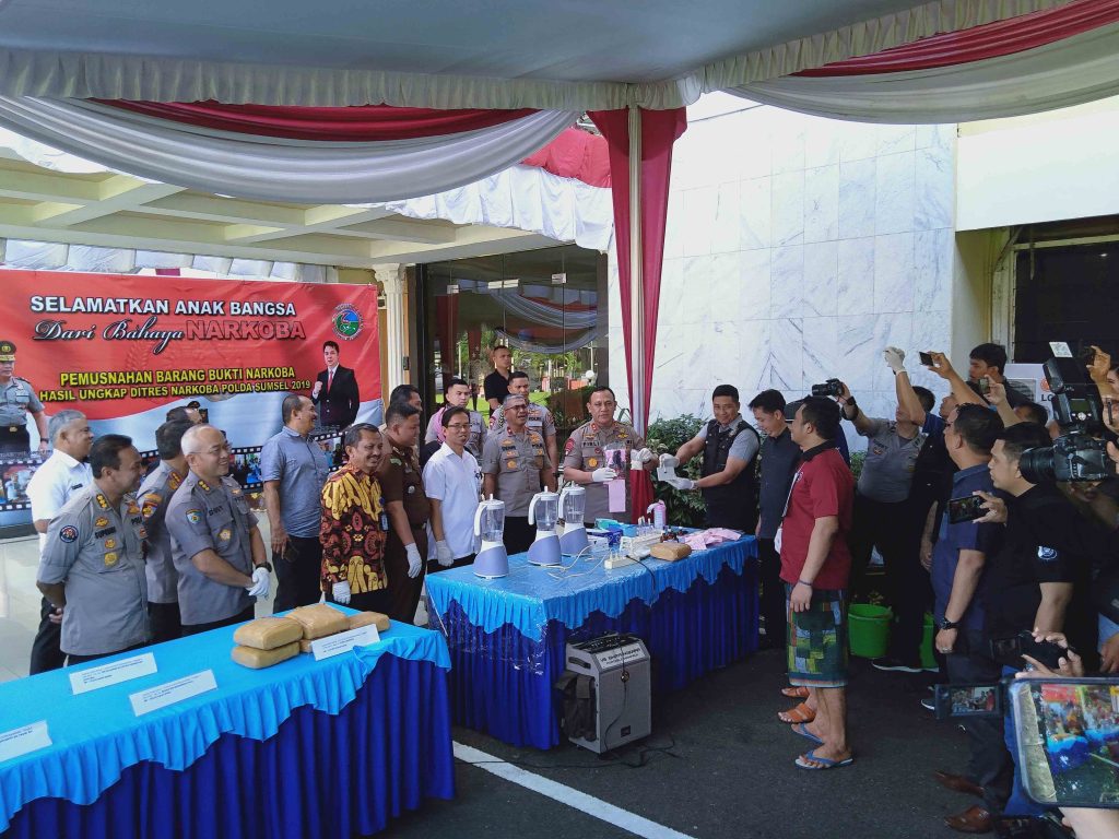 Selasa, (09072019) bertempat di halaman Polda Sumsel, berlangsung pemusnahan barang bukti narkoba hasil ungkap ditres Narkoba Polda Sumsel 2019, Kapolda Sumsel Irjen. Pol Firli mengatakan bahwa bahwa bahaya narkoba sangat dasyat, Masalah narkoba tidak akan pernah selesai selama ada permintaan barang. Menurut Kapolda penangkapan tersangka narkoba tidak akan menghentikan peredaran narkoba menurutnya jauh lebih penting adalah upaya pendidikan dan pencegahan. “Saya sebenarnya sedih dengan adanya penangkapan para tersangka, kenapa ?, karena penangkapan merupakan bukti kegagalan kita dalam mendidik dan mencegah gernerasi bangsa untuk menjauhi narkoba. dan ini jauh lebih penting, ” ucap Kapolda.