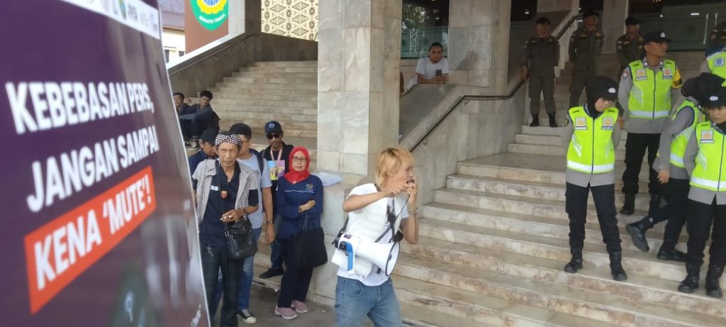 Massa sudah berdatangan sejak pukul 08.00 Wib dan orasi dimulai pukul 09.00 WIB. Mereka membawa spanduk bertuliskan “Tolak Revisi UU Penyiaran!!!” dan “Dukung Kebebasan Pers, Revisi UU Penyiaran anti demokrasi”.