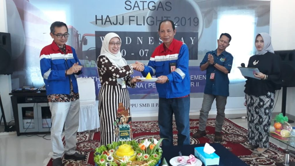 Dalam kesempatan ini GM MOR II Primarini melakukan pemotongan tumpeng sebagai tanda peresmian Tim Satgas Pertamina yang akan melayani penerbangan musim haji 2019 di Embarkasi Bandara Sultan Mahmud Badaruddin II Palembang.
