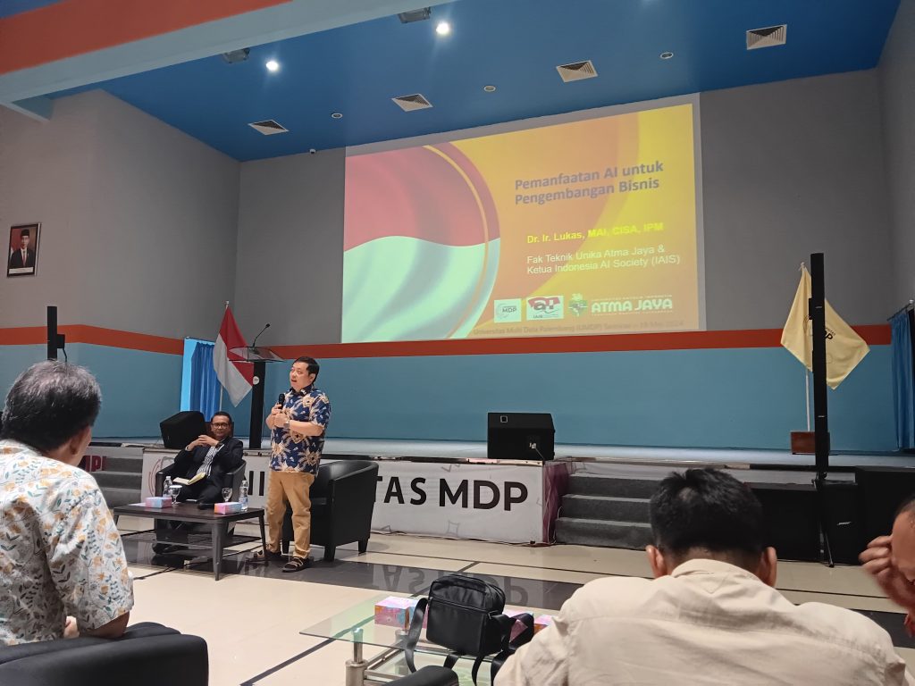 Dalam seminar ini Universitas MDP menghadirkan pembicara Ketua Indonesia Artificial Intelegence Society (IAIS) Dr. Ir Lukas, MAI, CIZA, IPM, mengusung tema “Pemanfatan AI untuk Pengembangan Bisnis”.