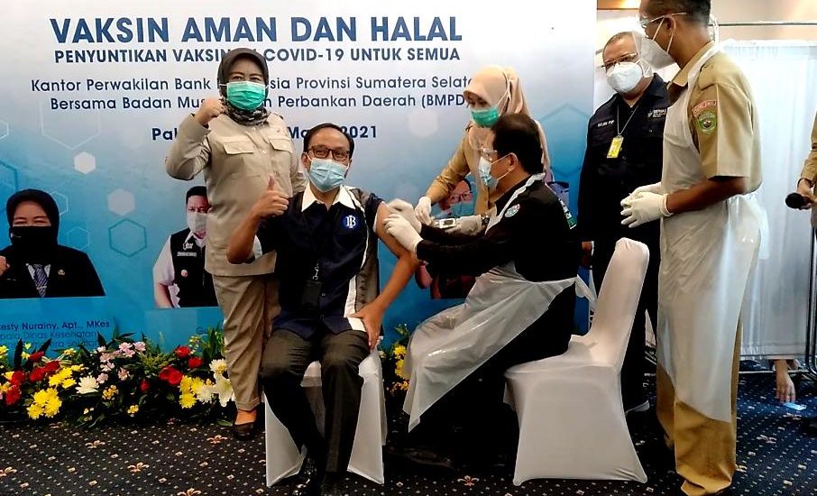 PALEMBANG SONORA – Sebanyak 236 pegawai perbankan yang terdiri dari pegawai Kantor Perwakilan Bank Indonesia (BI) Cabang Sumatera Selatan, Pimpinan Perbankan Swasta dan Anggota Badan Musyawarah Perbankan Daerah menjalani penyuntikan vaksin di Kantor Perwakilan BI Cabang Sumsel, Kamis (25/03). Kepala Perwakilan Bank Indonesia Cabang Sumsel, Hari Widodo memberikan apresiasi setinggi-tingginya kepada Pemprov Sumsel dalam hal
